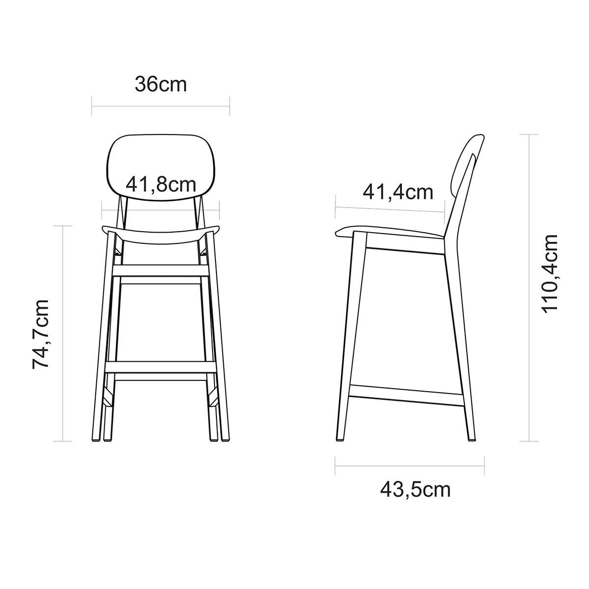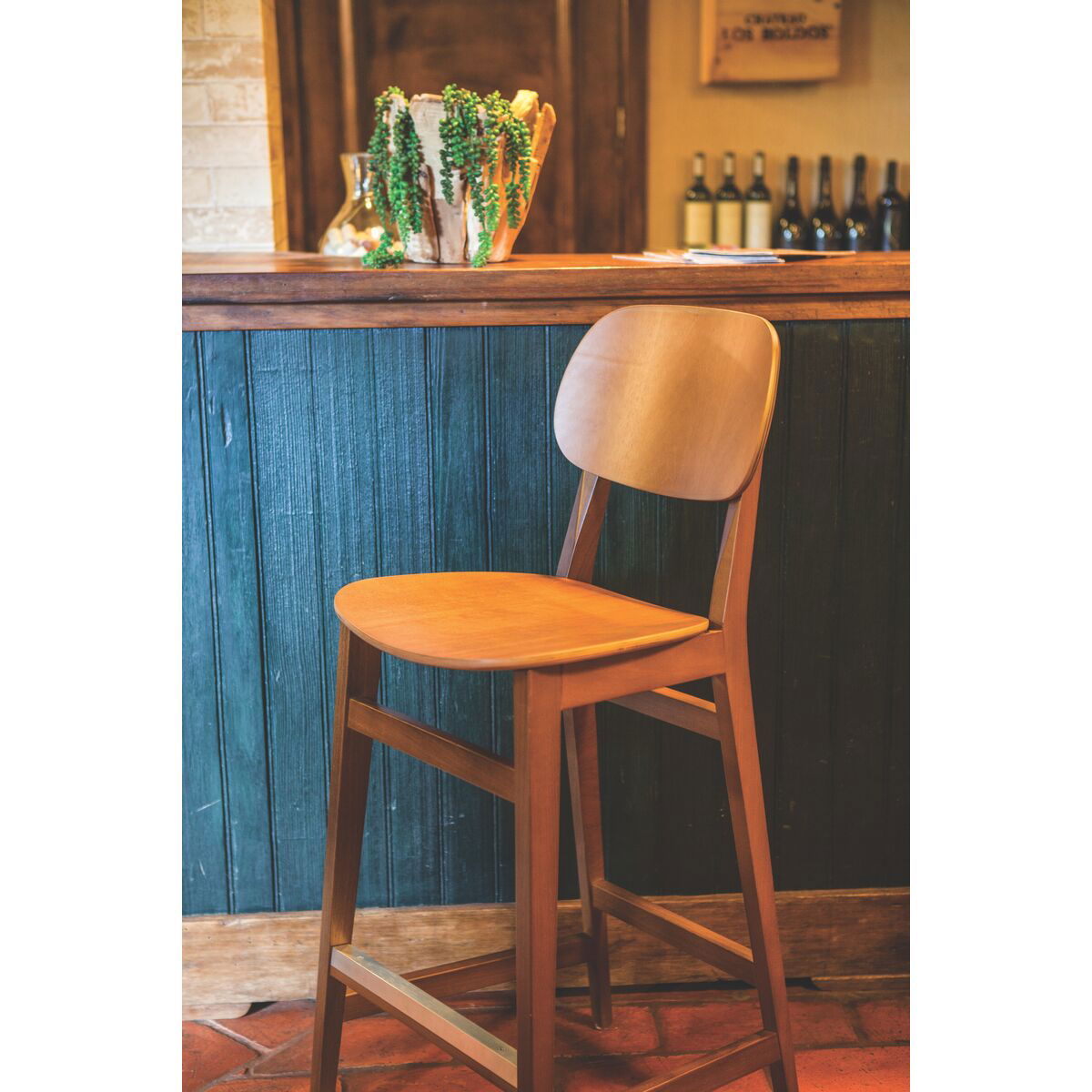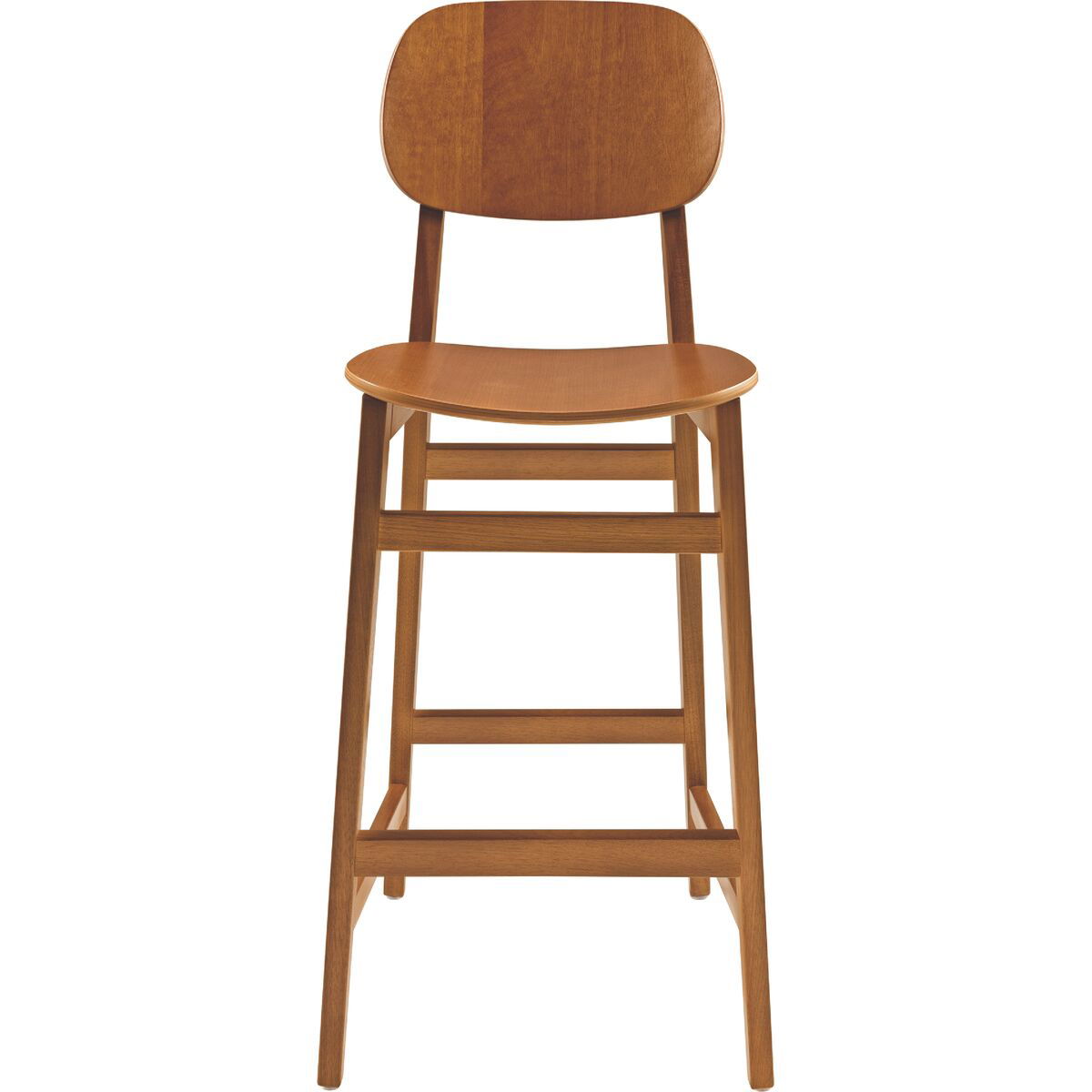 Banco alto de madeira tauarí. Acabamento com verniz tingido de amêndoa. Produto é entregue montado.