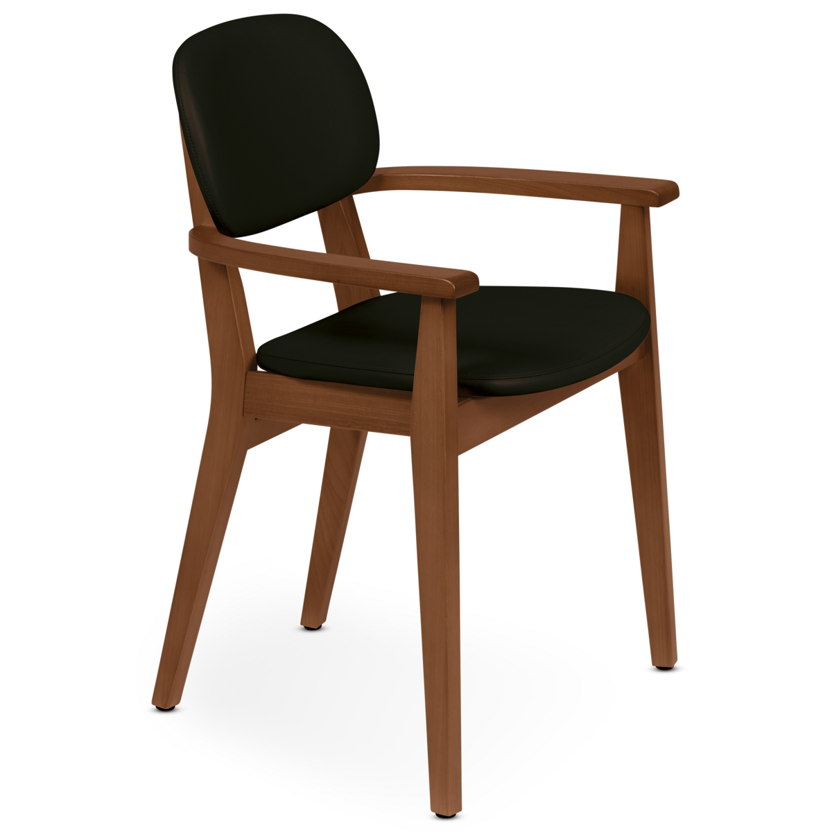 Cadeira com braços de madeira tauarí. Acabamento com verniz tingido de amêndoa. Assento e encosto estofado em couríssimo preto. Produto é entregue montado.