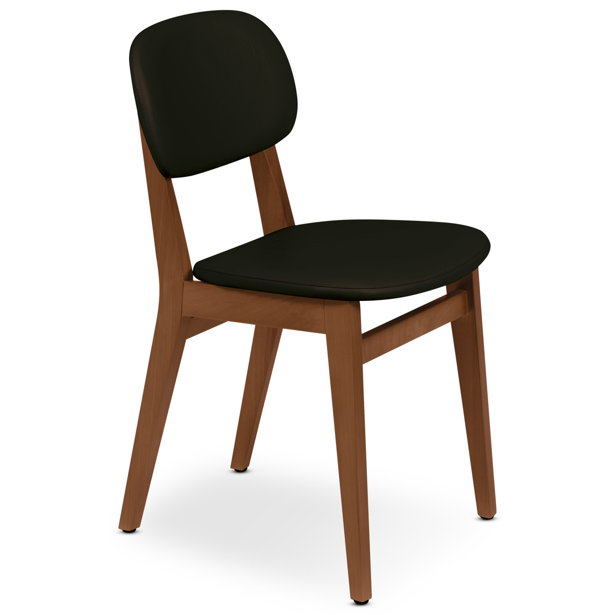 Cadeira sem braços de madeira tauarí. Acabamento com verniz tingido de amêndoa. Assento e encosto estofado em couríssimo preto. Produto é entregue montado.