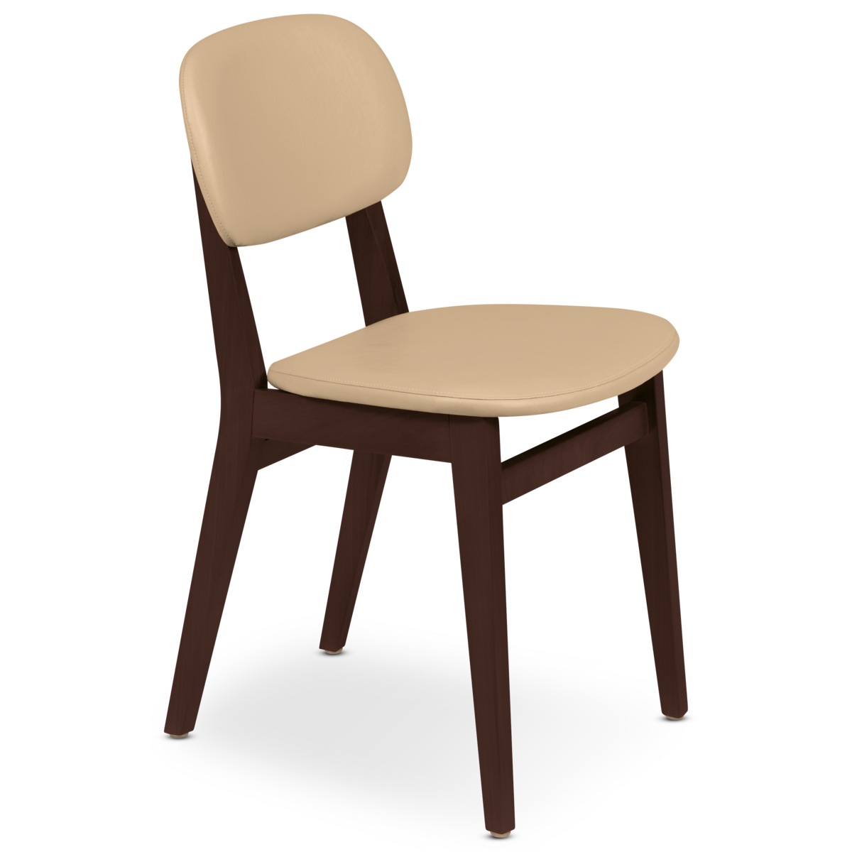 Cadeira sem braços de madeira tauarí. Acabamento com verniz tingido de castanho escuro. Assento e encosto estofado em couríssimo bege. Produto é entregue montado.