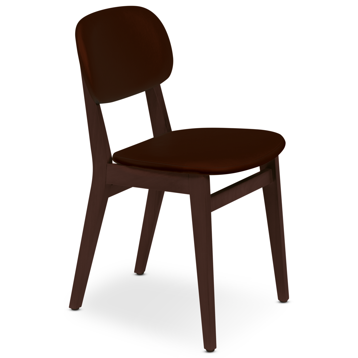 Cadeira sem braços de madeira tauarí. Acabamento com verniz tingido de castanho escuro. Assento e encosto estofado em couríssimo café. Produto é entregue montado.