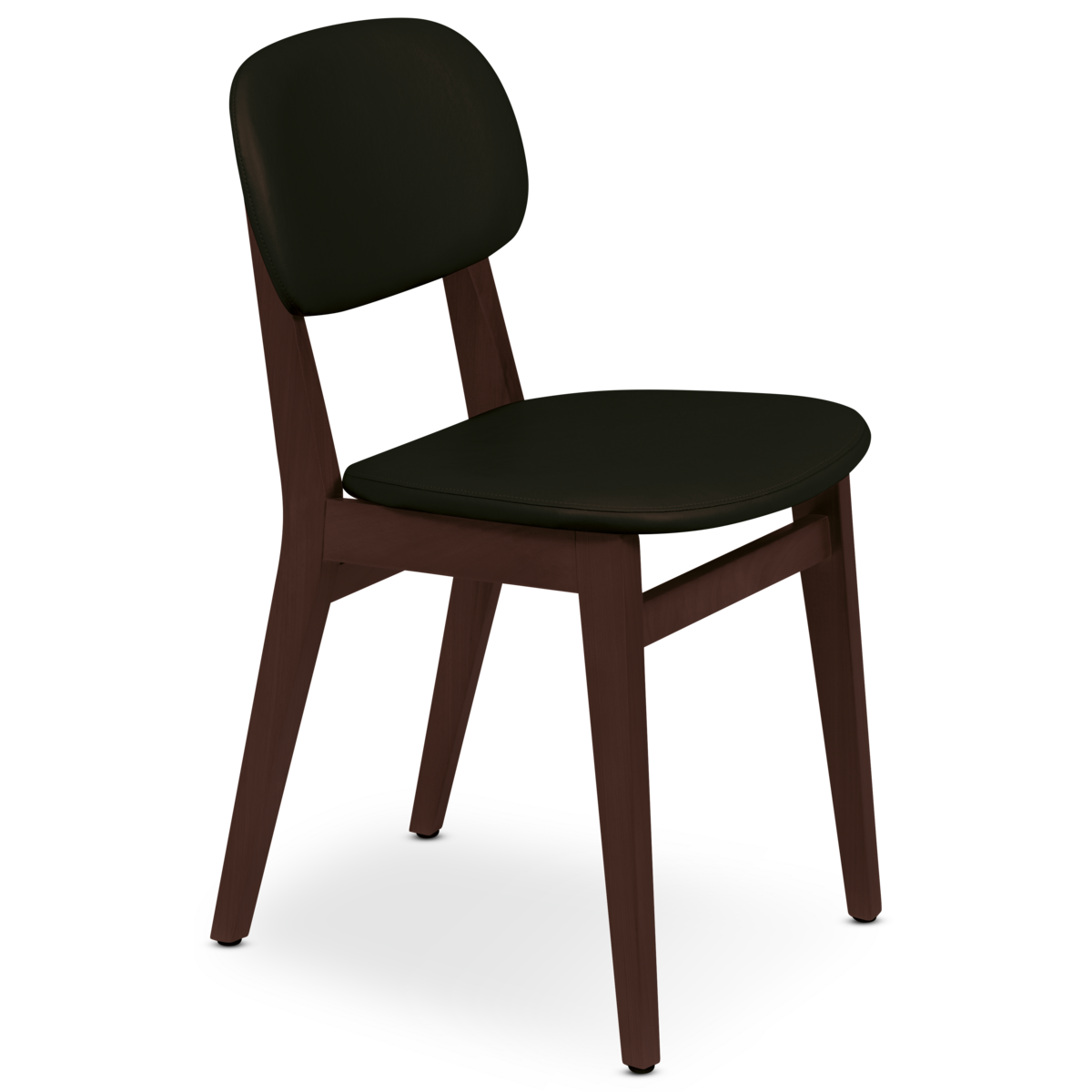 Cadeira sem braços de madeira tauarí. Acabamento com verniz tingido de castanho escuro. Assento e encosto estofado em couríssimo preto. Produto é entregue montado.