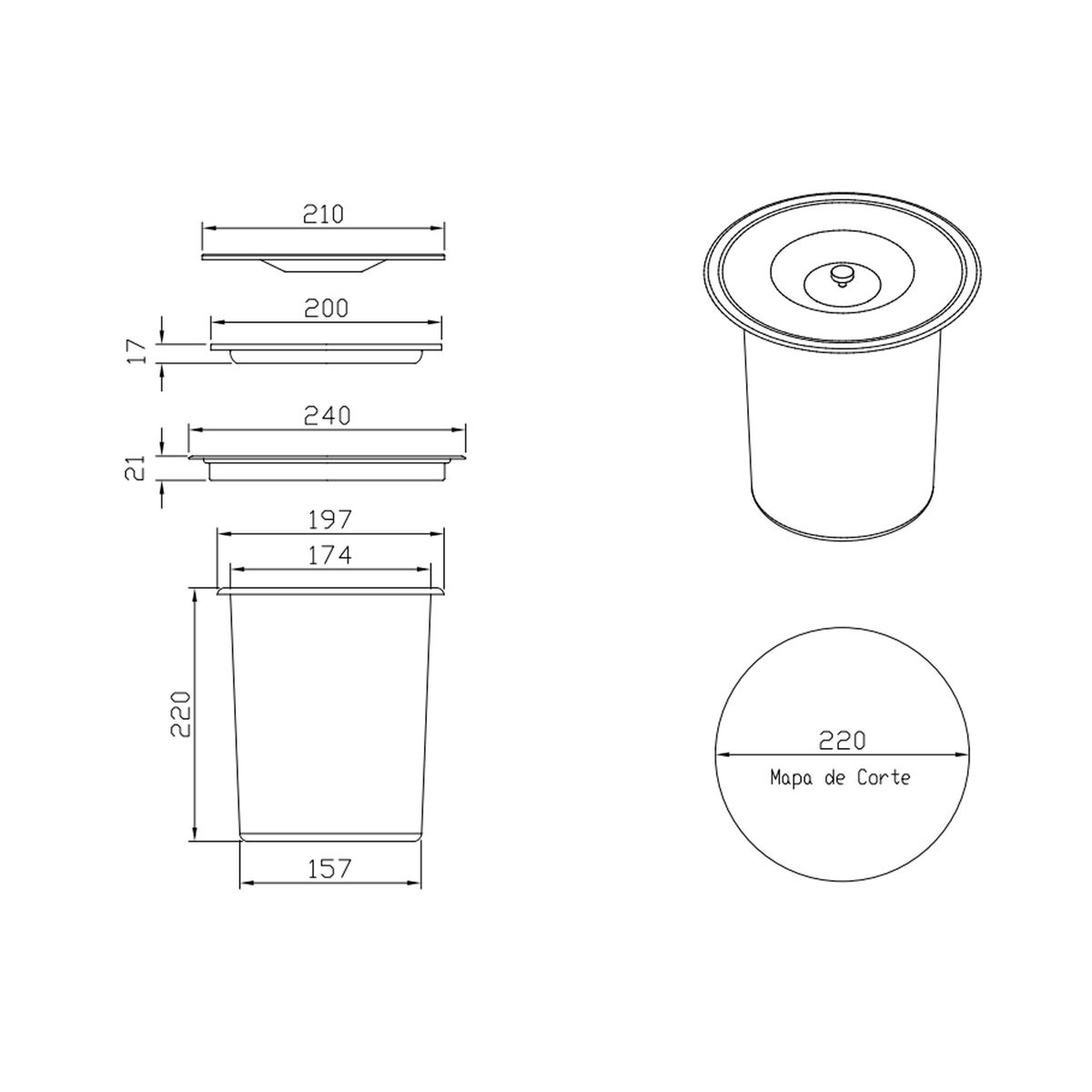| Características Adicionais | Aros internos para melhor ajustar a tampa da lixeira |