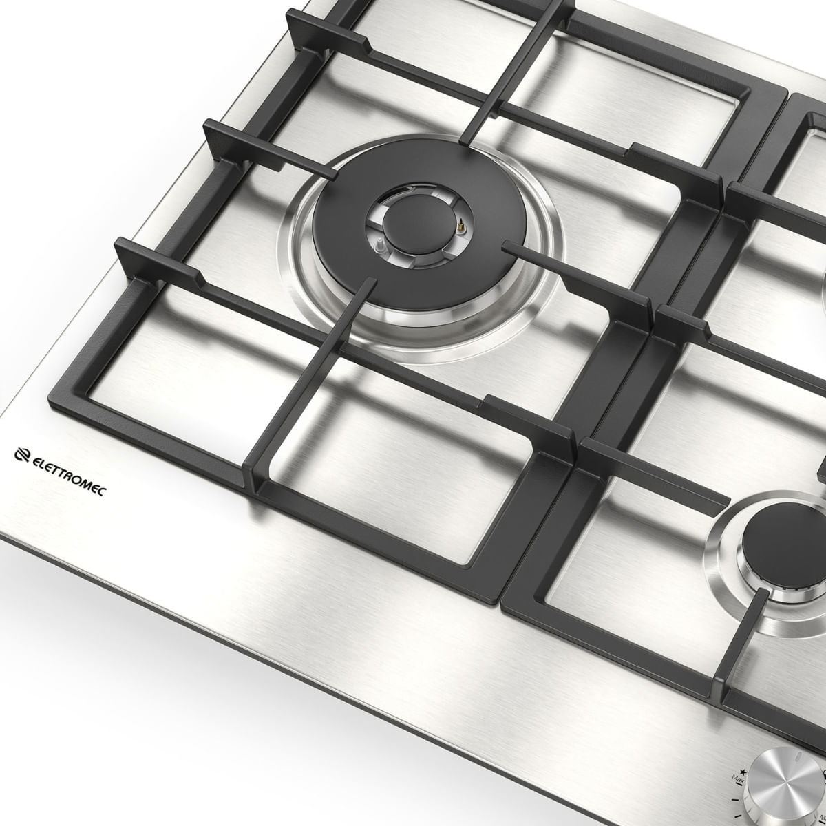 - Potência total de 11,3kW: Com suporte para panela Wok e válvula de segurança que corta o fornecimento de gás caso a chama apague, para uma experiência culinária sem preocupações.