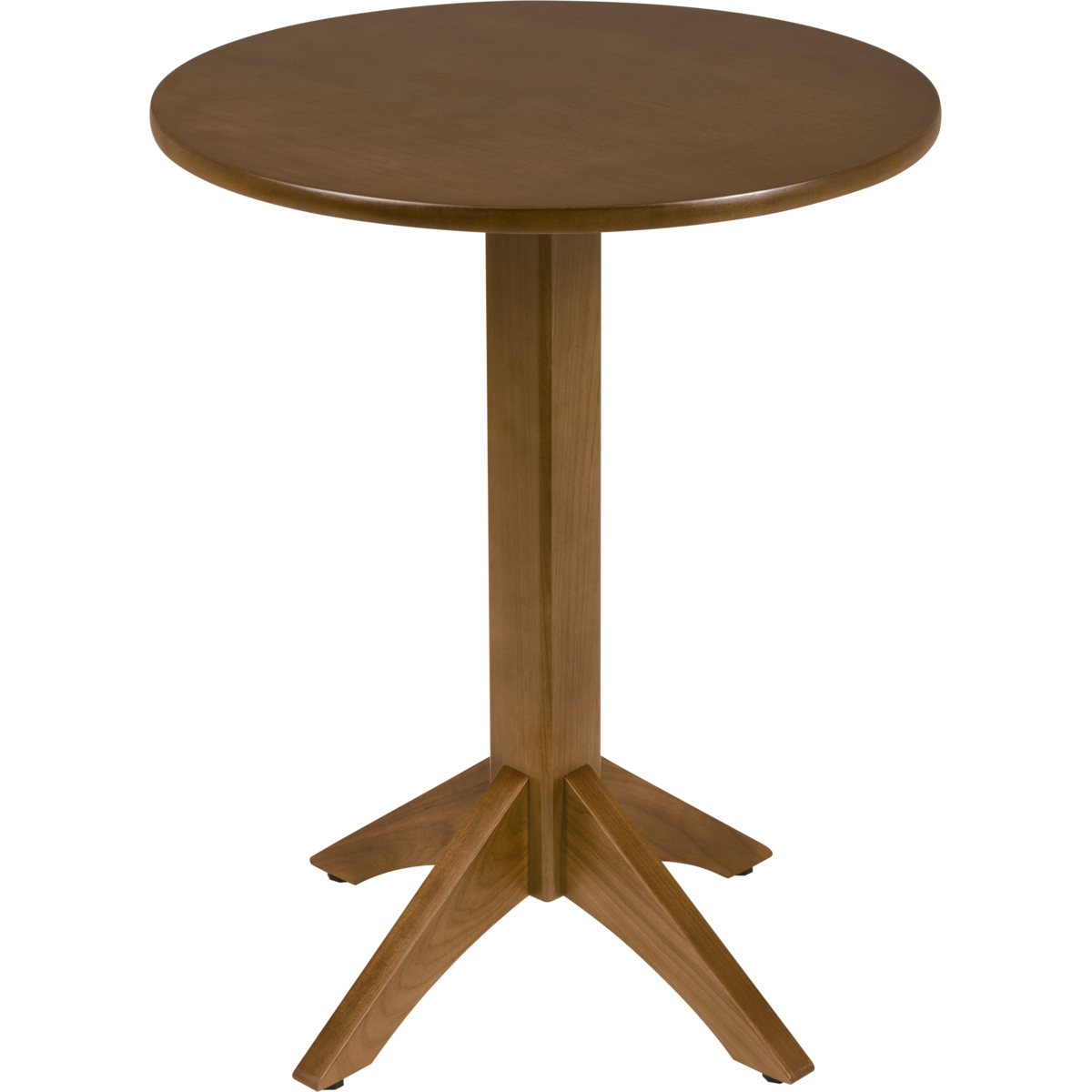 Mesa de madeira tauarí. Acabamento com verniz tingido de amêndoa. Tampo redondo de 60 cm. Produto é entregue desmontado.