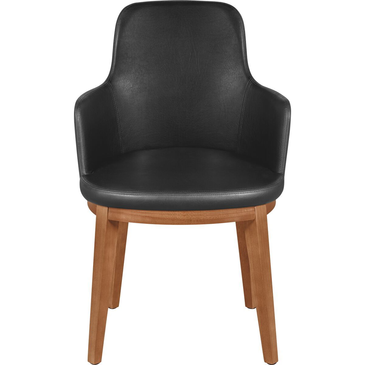 Poltrona em madeira tauari. Acabamento amêndoa e estofado em couríssimo preto. Os encostos e os assentos das poltronas, em linhas curvas, tem dimensões confortáveis e forma anatômica. Um design harmonioso que combina com qualquer ambiente interno.
