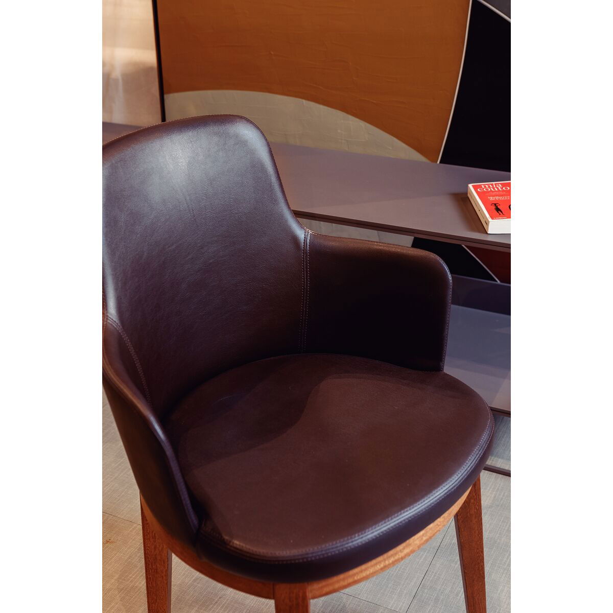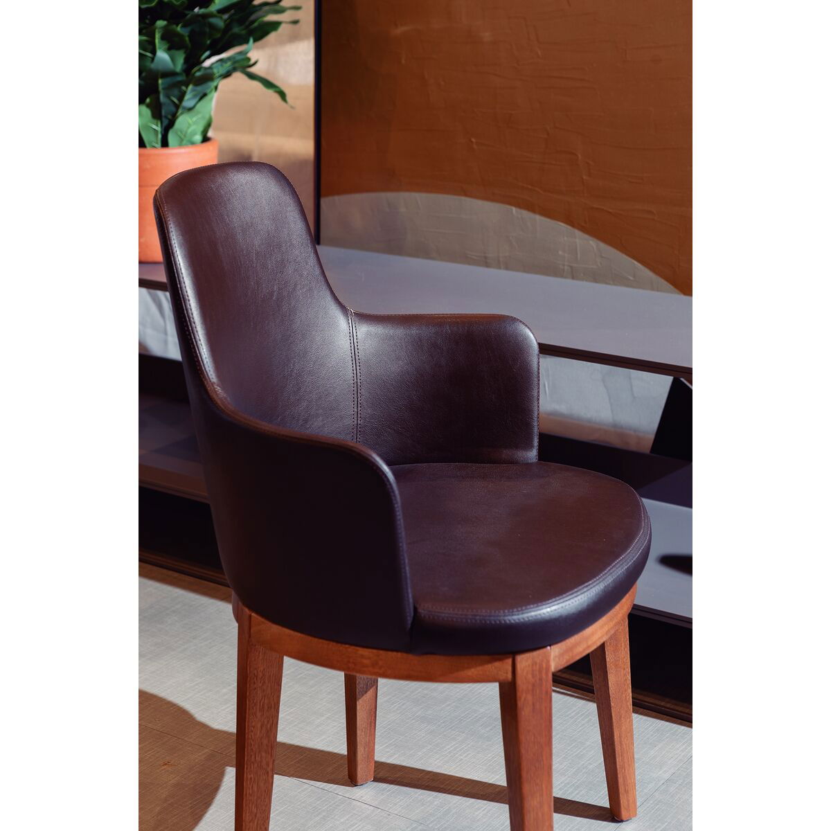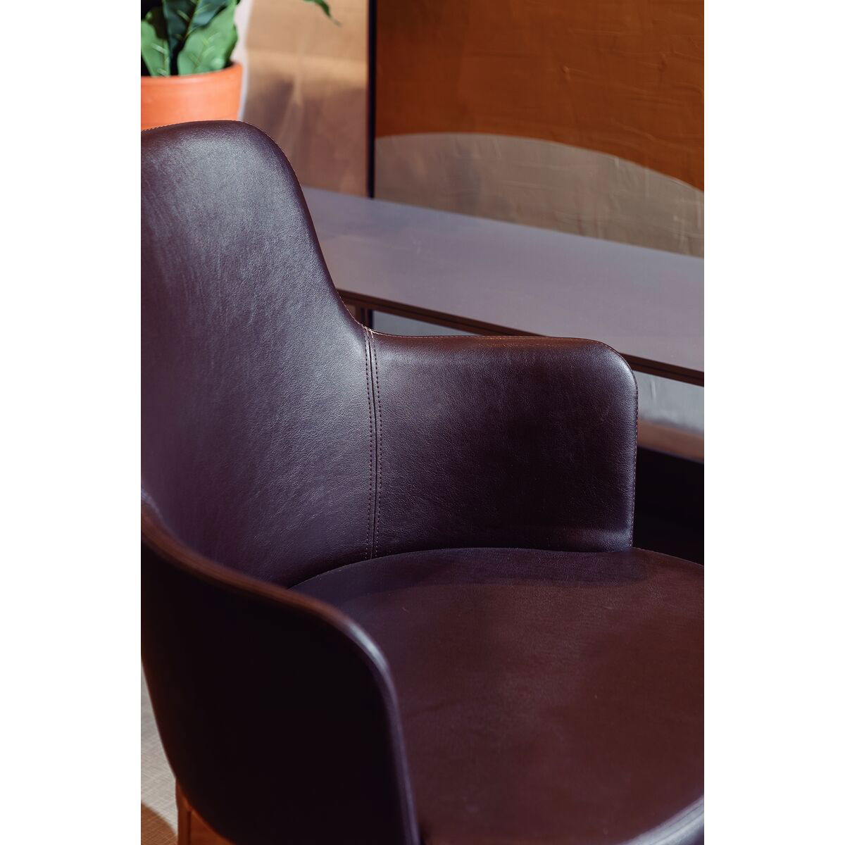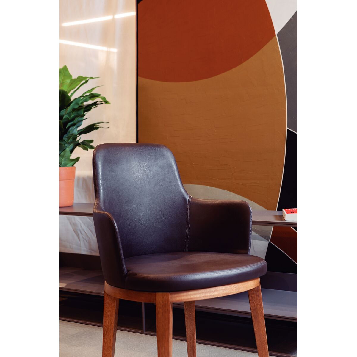 Poltrona em madeira tauari. Acabamento amêndoa e estofado em couríssimo café. Os encostos e os assentos das poltronas, em linhas curvas, tem dimensões confortáveis e forma anatômica. Um design harmonioso que combina com qualquer ambiente interno.